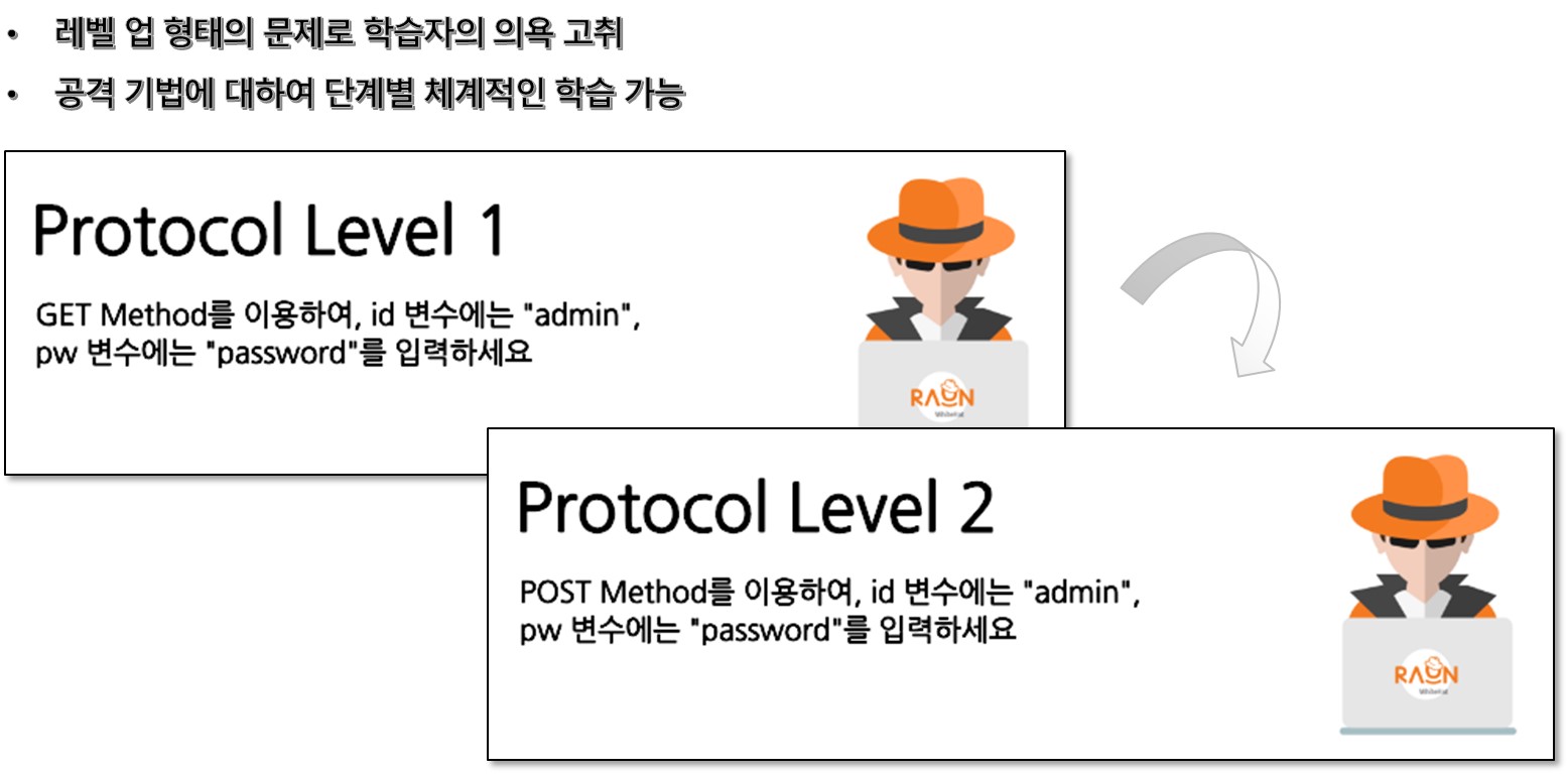 RAON CTF 실습 문제는 레벨 업 형태의 문제로 학습자의 의욕을 고취시키고, 공격 기법에 대하여 단계별로 체계적인 학습을 수행할 수 있습니다.